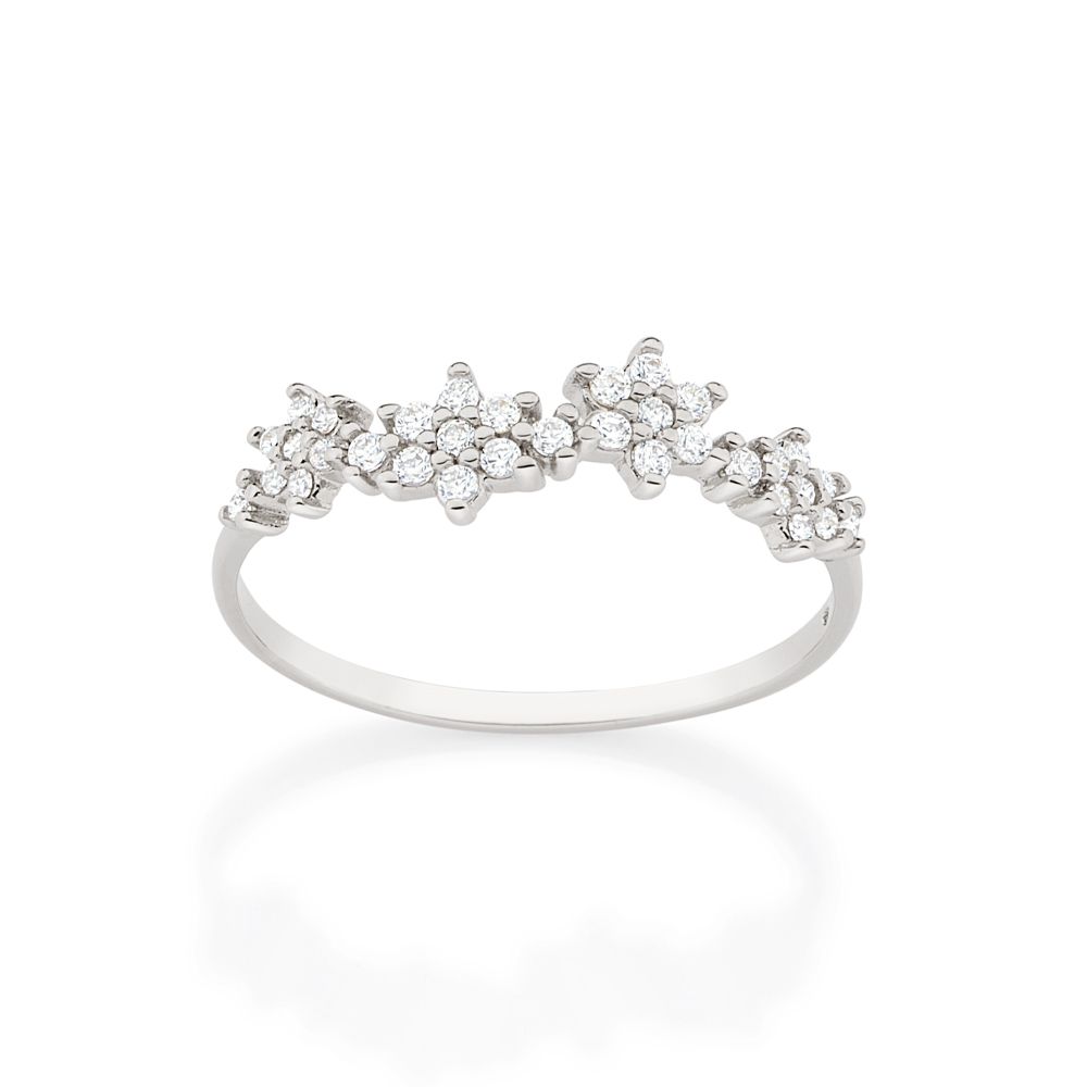 Anel Rommanel Skinny Composto Por 4 Flores Cravejadas Por 14 Zircônias De 1,0 Mm E 19 Zircônias De 1,25 Mm,