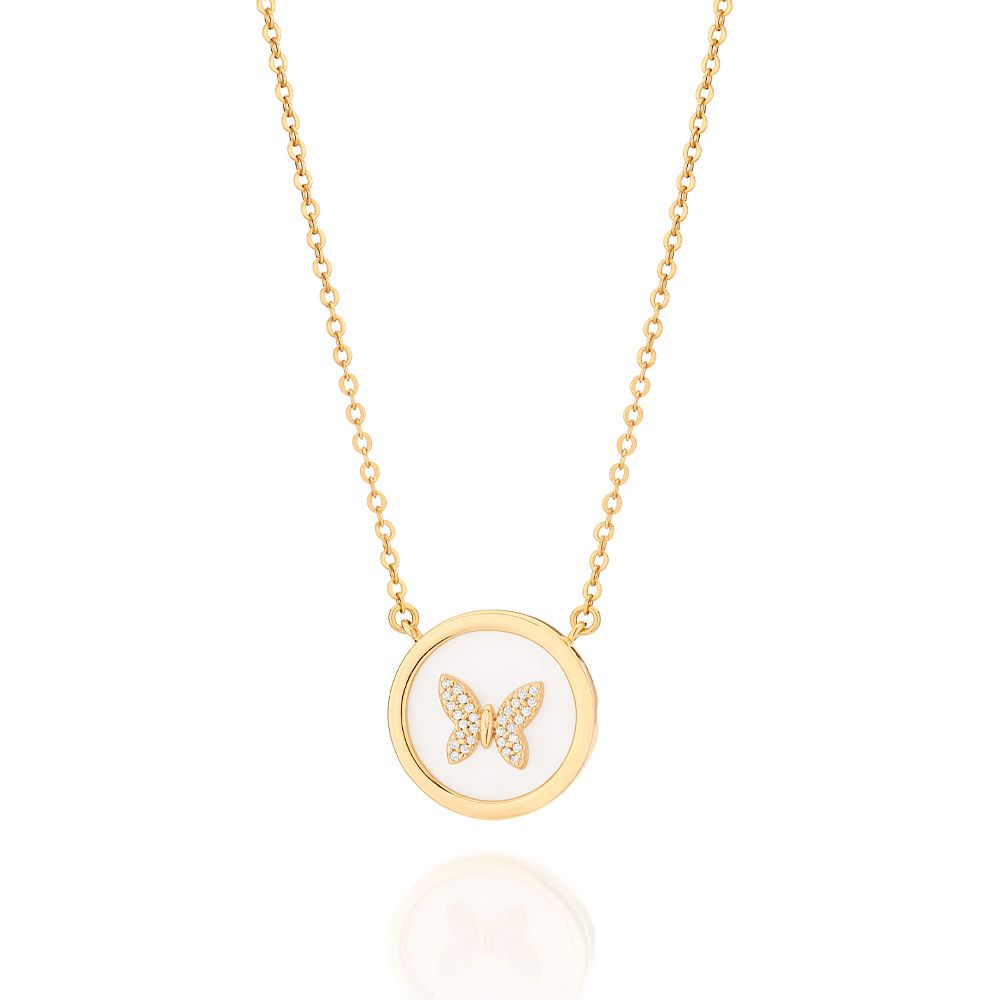 Gargantilha Rommanel Formada Por Corrente De Elo Cadeado Fio 0,35 Mm, Composta Por Pingente Rommanel Com 1 Madre Pérola De 16 Mm E Borboleta Ao Centro Cravejada Por 30 Zircônias De 0,8 Mm,Med 50 Cm Ajustável 45 Cm - 532367
